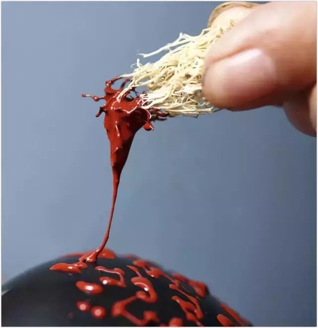 等埝完全干透,就可以刷上不同颜色的色漆,反复涂刷15次,漆层也只有1毫米厚。漆需要反复涂40遍,每刷一遍需要阴干,才能继续下一次。漆在没有完全干透的情况下,绝对不可以刷第二遍。
