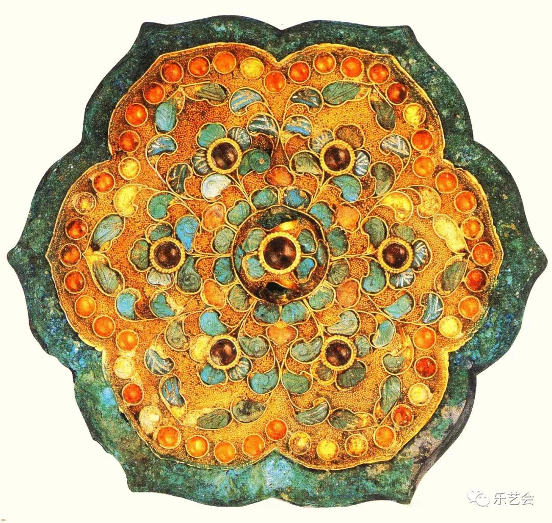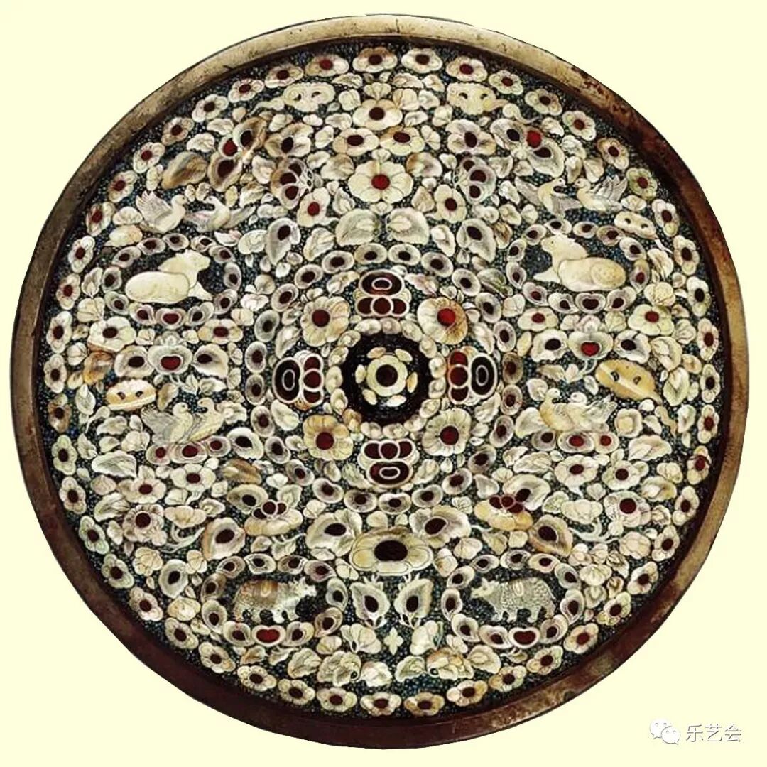 薛爱华的《撒马尔罕的金桃——唐代舶来品研究》对西域、南海,特别对西域各类金银漆艺宝钿及其原材料、工艺技术的传入作了详细的介绍,特别提到了跟随丝绸之路来华的波斯人——将金银精工打制、珠宝镶嵌教授给了唐朝工匠,这些新型工艺、新题材的装饰纹样的传入,极大地提升了唐代金银宝钿器物的制造技术、艺术审美的质量,拓展了已有奢侈物的品类[19]并迅速地进入了中国铜镜的铸造基地——扬州,这些来自异域的精美材料、独特的纹饰样式和精巧的制造工艺在“奢靡成风”的盛唐很快被用于铸造奢华无比的各种特种工艺镜,特别是对中国的螺钿镶嵌工艺起到了较大的改进作用,来自西域和南海诸国进贡的夜光贝、珊渭、玳瑁、珊瑚、琥珀、青金石、绿玻璃、黄玉、绿玉髓、绿松石被用作铜镜背面的镶嵌物,各种巧夺天工的镶嵌工艺技术在嵌宝的铜镜上被发挥到极致,中国至此创造性地造出了盛唐独有的螺钿镜,并成为君臣、邦国之间政治关系的承载物。