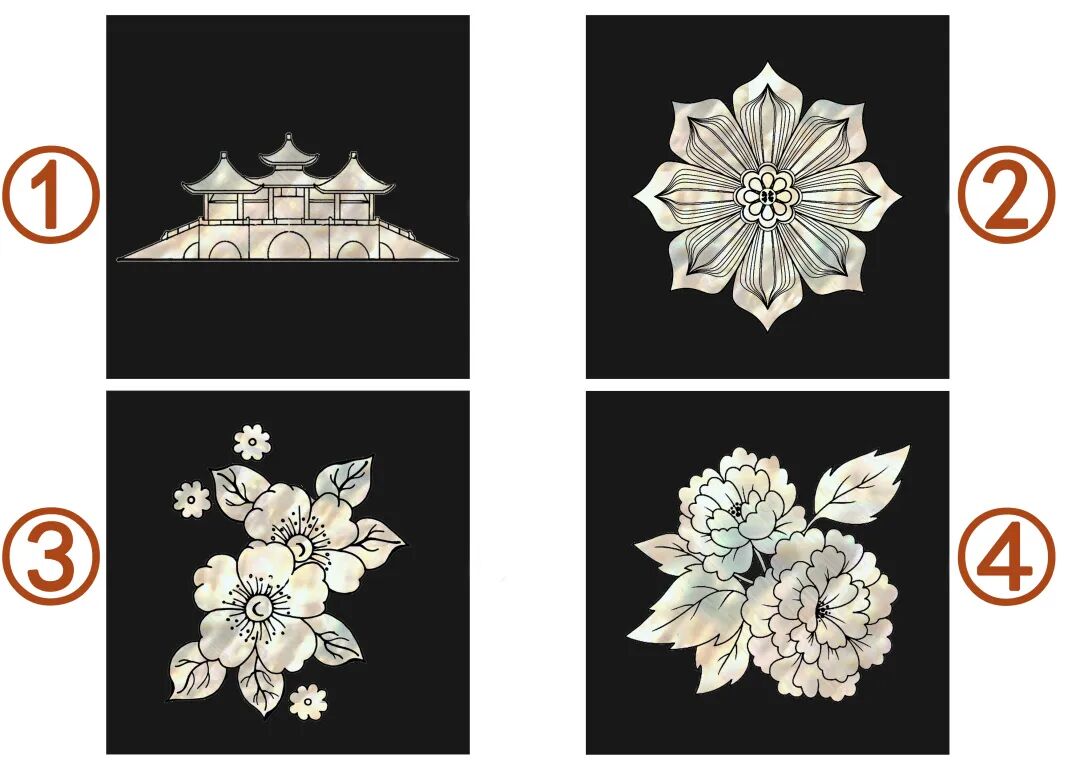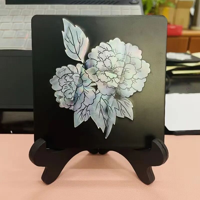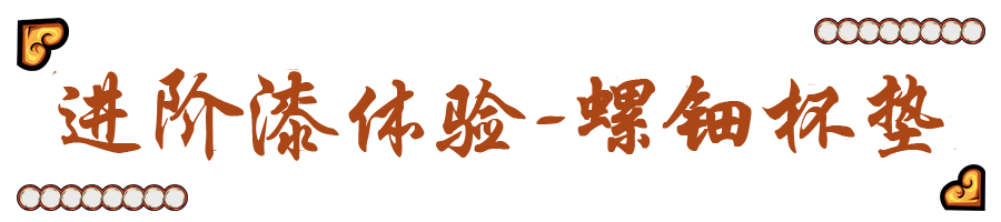 我们将提供已下好不同形状的螺钿料,体验者将在提前下好的螺钿料上,根据教材所提供的纹样用蘸水笔蘸取墨汁在螺钿料上进行绘画,待墨水干燥后完成。课程结束后,我们将对产品进行罩漆工艺并进行打磨,一周后即可完成所有工艺步骤,寄出到每位体验者的手中,作为此次研学活动的纪念品。此平磨螺钿产品可做杯垫亦可作摆台(配备座架一起寄出)。
