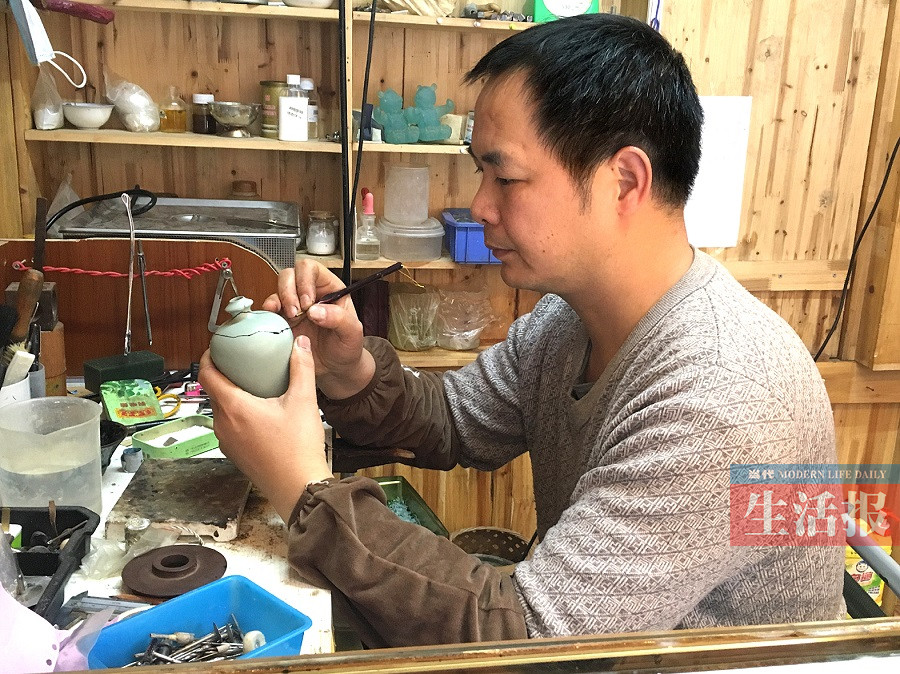 韦旭敏原来学的是珠宝设计专业,之前在外地工作,2016年年初回到南宁。他发现南宁从事残损器物修复的人不多,于是就开了这家店,”手艺是自学的,自己看书、上网跟专业人士学习讨论。”这话虽然听起来云淡风轻,可手艺哪是这么容易就能练成。