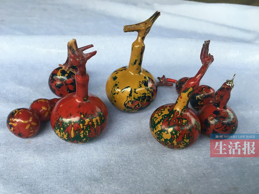 犀皮漆,变涂,又称犀皮,技法起源于唐朝,在宋朝时十分流行,特指中国古代漆器制作中的一种装饰工艺。它先将不同颜色的漆料堆涂在高低不平的器胎上,漆料干燥后再经打磨,从而产生出色泽亮丽、光滑异常、自然生动的艺术效果。韦旭敏的店里,有不少犀皮漆作品,用天然葫芦制作,小的规格为2.2厘米直径,高5厘米。犀皮漆作品需要在葫芦上打捻,制作出凹凸状,上多种颜色,颜色要上得薄,否则打磨过后没有纹理,每次都要等上一层干燥再上另外一层颜色,经过手工细细水磨等程序制作出来,他最多的作品上了7层颜色。