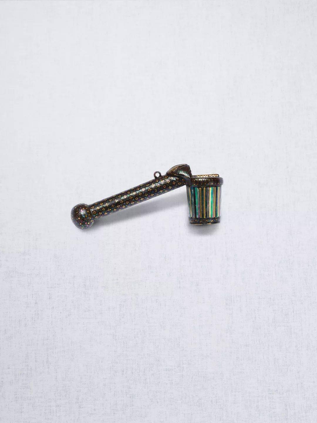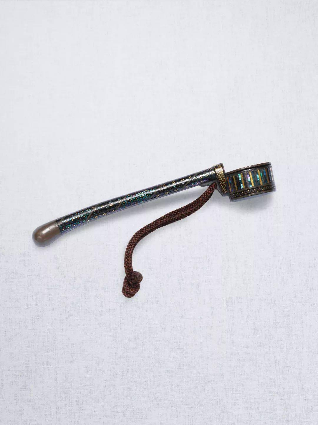 下图两件明治时期的螺钿矢立以珍珠母作装饰,而且没有拼砌出任何图样。虽然这两件作品看似简单,但其实对工匠的手艺要求也非常高。因为每一片的贝壳的颜色与光泽都会随着角度改变,所以在切割和镶嵌时要配合着一定的方向和角度,才能突显贝壳天然光泽所带来的变幻美。