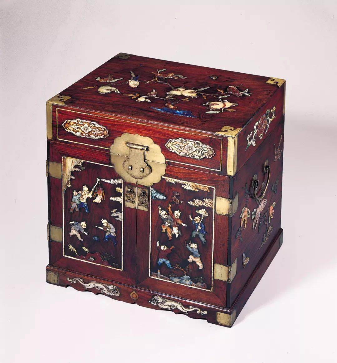 除了上述寓意长寿的紫檀嵌百宝盒,製于十八世纪的黄花梨嵌百宝官皮箱亦是一个好例子。此件官皮箱以珍珠母、玛瑙、珊瑚、象牙及青金石镶嵌,箱顶以花鸟、蝴蝶、蜻蜓和石榴作装饰;箱体两侧亦嵌有多种图样,如佛手、梅花和牡丹;而门板则镶以百子图。以此来看,这件嵌有各式各样吉祥图案的作品,非常适合当作嫁妆:首先石榴多籽象徵多子多福,而绽开的石榴更有「榴开见子」的寓意,以祝福新人早生贵子;更别说门板上的百子图,代表子孙昌盛、万代延续。