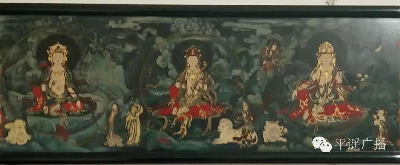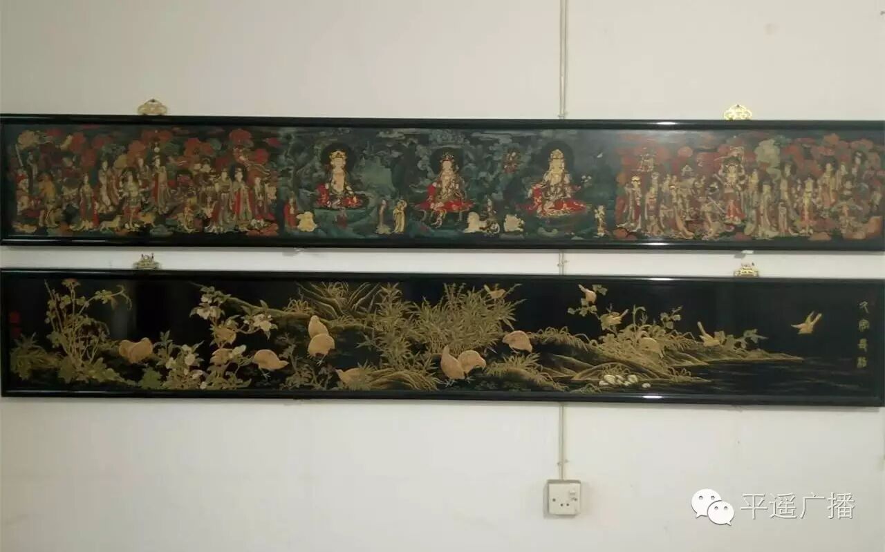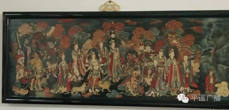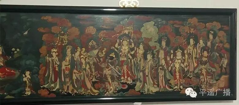 【贾兴林:主要是以人物的造型,它的线描,以它的贴金,以它的制作工艺的精细,你看它各个人物不同的表情以及它的动态,以及它的道具,这些东西确实是太美,包括它的背景,五祥的彩云,体现了这个佛跟菩萨的泰然自若这个神情,这个也是咱们传统工艺,咱们平遥漆艺最为经典和最为点睛之处】