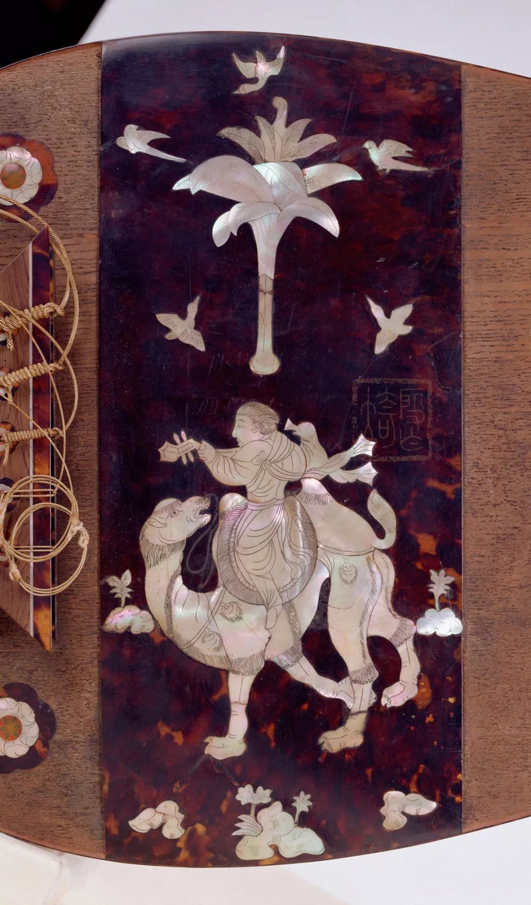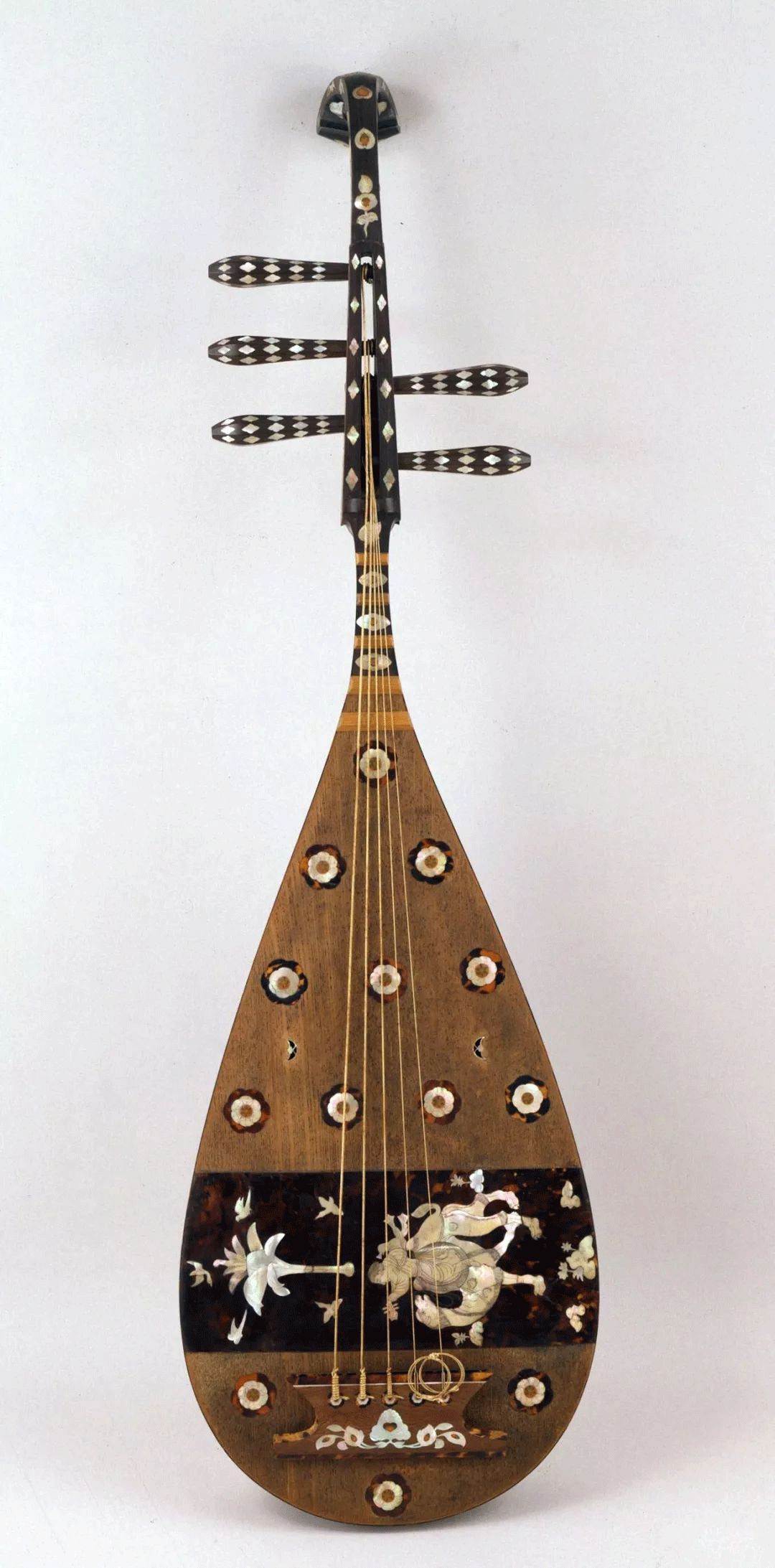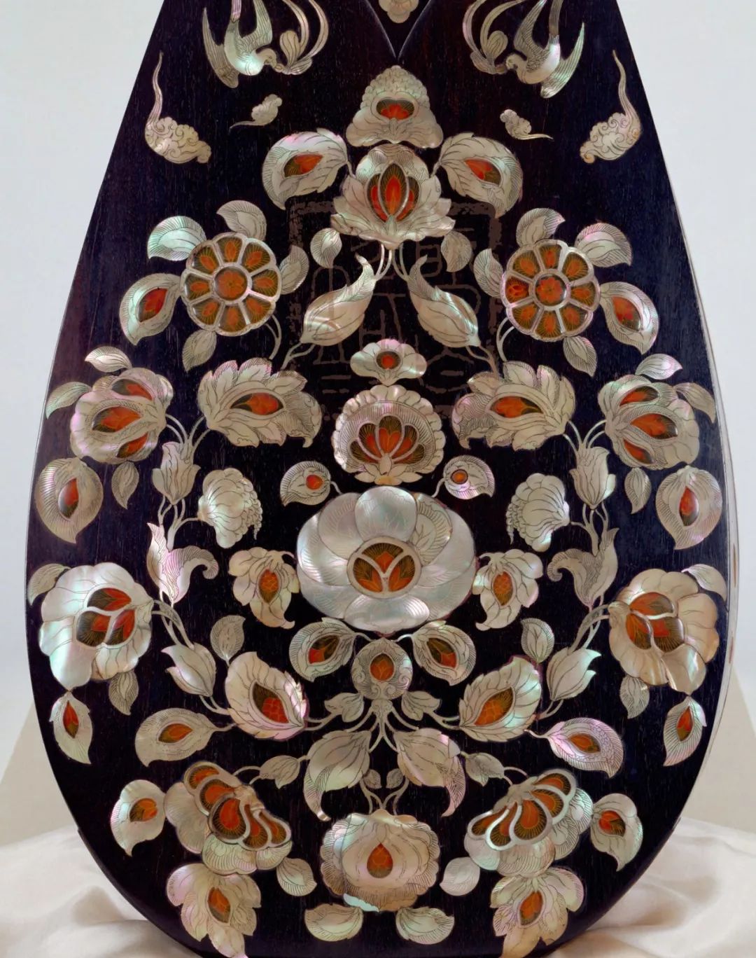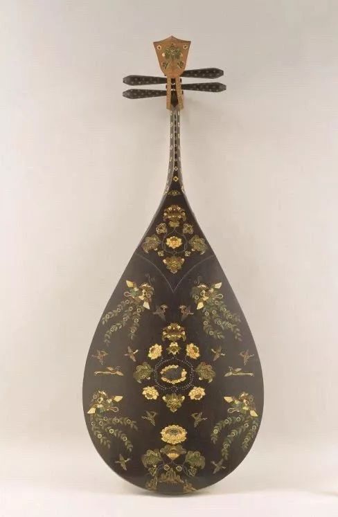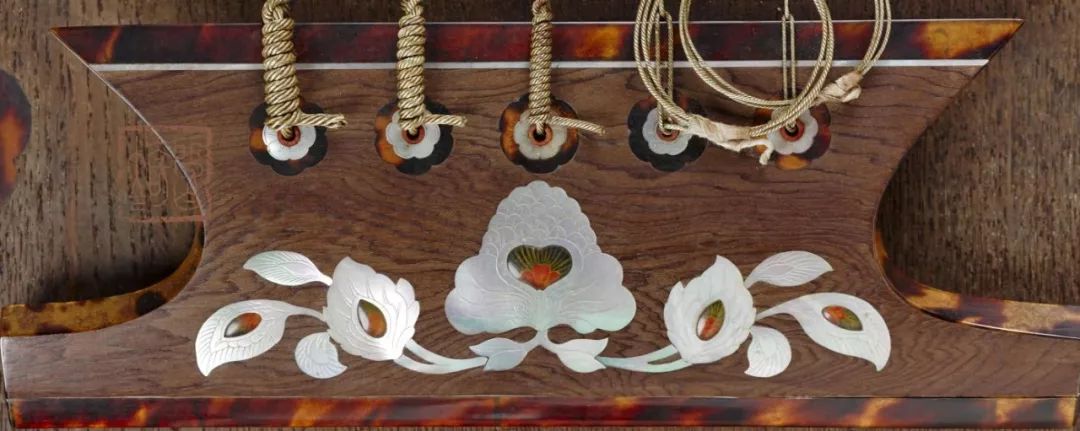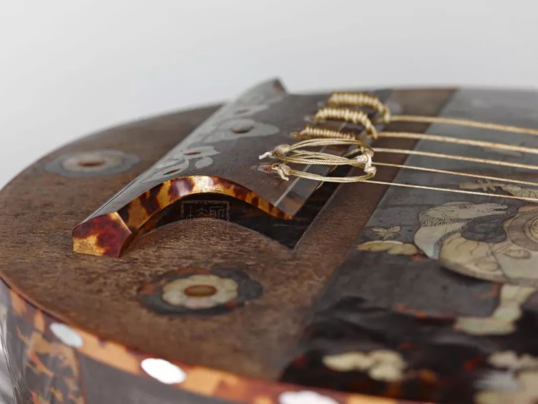 琵琶正面下方装饰带(捍拨)全部使用玳瑁贴面为地,重装螺钿作珍珠色。