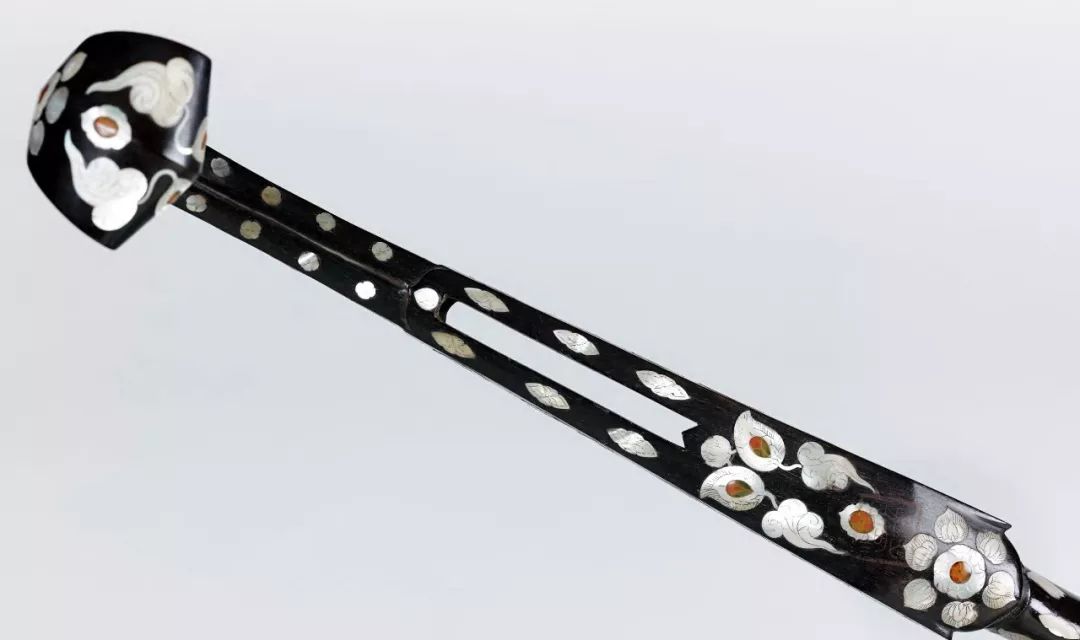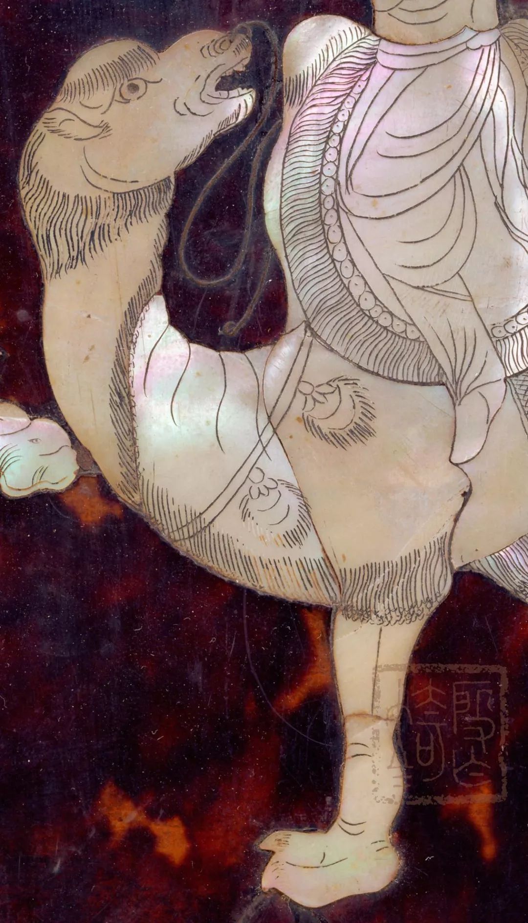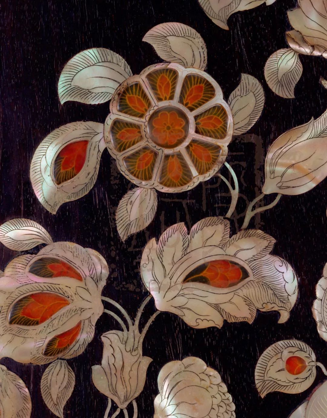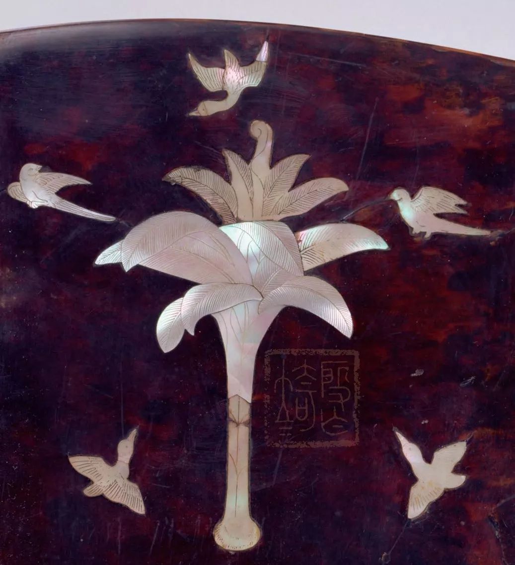 背面的螺钿以宝相花纹样为主,花蕊、叶蕊处施用色彩艳丽的琥珀,使整个纹样立体感强烈。