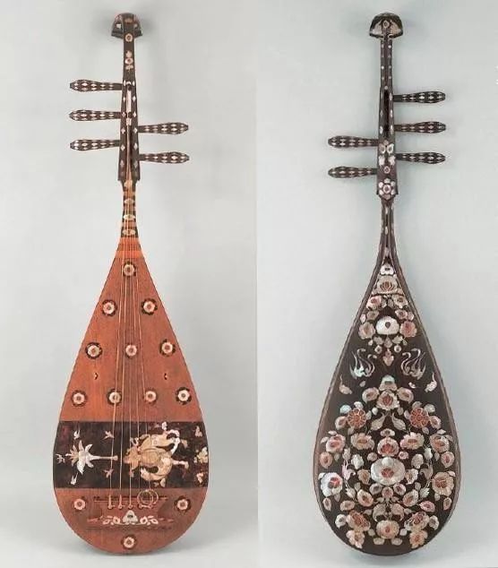 日本奈良仓正院藏唐代螺钿紫檀五弦琵琶,它是我国唐朝宫廷送给日本圣武天皇的礼物,是目前世界上仅存的五弦琵琶传世杰作。此琴背板及琴轸、琴头为紫檀木,面板为梣木,直项,琴轸分列琴头两侧,左三右二。施螺钿花纹,腹面杆拨处还贴以玳瑁薄片,其上用螺钿嵌出一骑驼人抚弹琵琶的美丽画面。