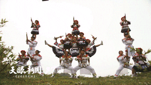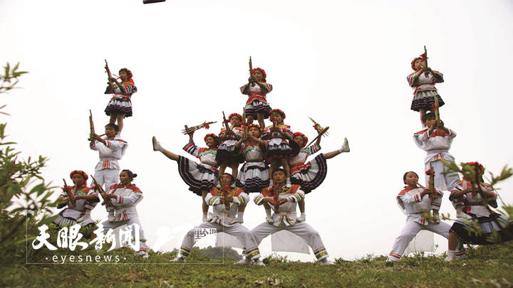 头戴野鸡翎帽,身着绣花服饰,或以头为足,或以人攀肩,节日或农闲时节,苗族同胞们就在盛满水的碗与碗之间,边吹芦笙边表演舞蹈动作。这便是苗族芦笙舞“滚山珠”。