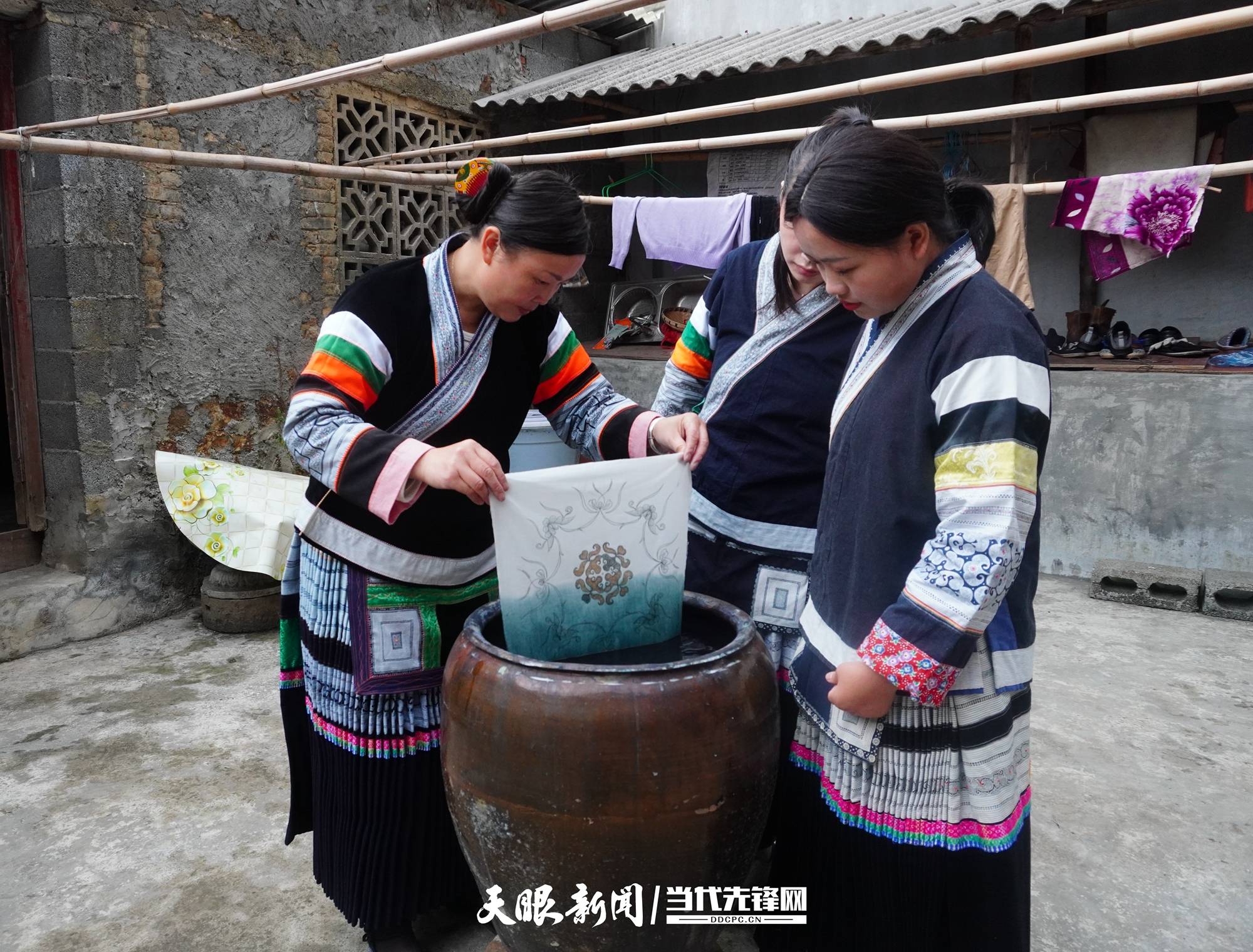 蜡布画好后,开始染色。染料以织金山区特有的板蓝根、白蒿根或青蒿根、鱼鳅串、毛毛菜、血藤等植物的汁液为主要原料。染色时根据浸泡的时间长短来决定染色的深浅度。待染色达到满意的效果后,便进行脱蜡。脱蜡时,将染好色的画布,放入烧开的水锅里,使蜡熔化到沸水中后将其取出。脱蜡完成后是漂洗,将脱了蜡的画布放到清水中洗除杂质,待晾干后一幅完整的蜡染就制作完成了,蜡染再经过锁边、缝纫、装裱等深加工,即成为手工艺品。2021年6月,国务院公布第五批国家级非物质文化遗产代表性项目名录,织金苗族蜡染榜上有名。
