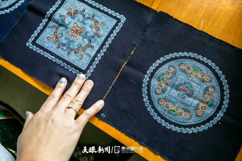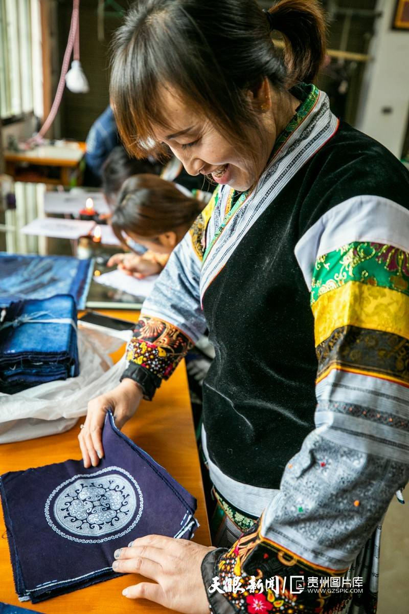 织金蜡染有三大特征:线造型、精细化、满构图。苗族妇女用蜡刀在织物上画蜡,记录民族的历史、图腾以及对美好生活的无限向往。织金蜡染大多数部位仅留1根纱线宽的蓝底,因此需要画蜡的部位多,制作难度大。
