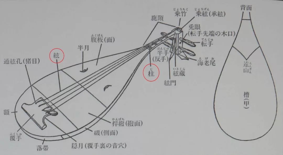 除了穷尽奢华的工艺。“五弦”也是极为重要的关键词。这代表它不是一件常规的琵琶。与正仓院所藏的另外几件四弦琵琶,是不一样的。它们最大的区别在于结构不同。紫檀嵌螺钿五弦琵琶为五弦五柱,而常规四弦琵琶为四弦四柱。