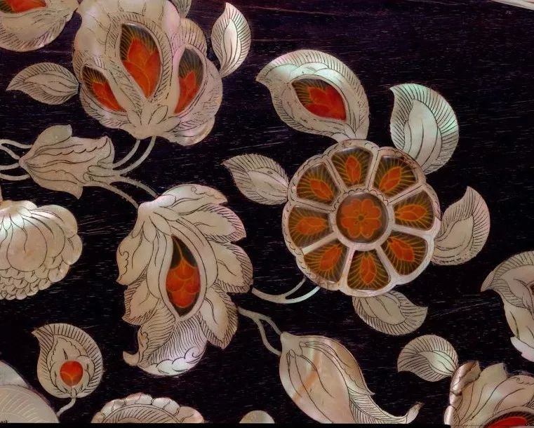 别急,看到这里还没完工,花叶形螺钿的中心处,用红色、绿色的彩,描出更细致的花形纹样,并以金线描边;又在花纹表面覆盖一层琥珀或玳瑁所制成的半透明薄片,使花纹呈现出若隐若现的灵动之感,乐器表面也呈现凹凸的质感。